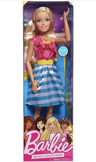 Barbie 28" Best Fashion Friend Doll, Brown Hair, Ages 3 + - Walmart.com Barbie Best Fashion Friend Doll stands 28" tall., Doll comes dressed in a fashionable removable outfit., Barbie features articulated arms so you can move her into fun poses!, Features deluxe rooted eyelashes., Comes with trendy accessories including: purse, shoes, and necklace., Ages 3+
